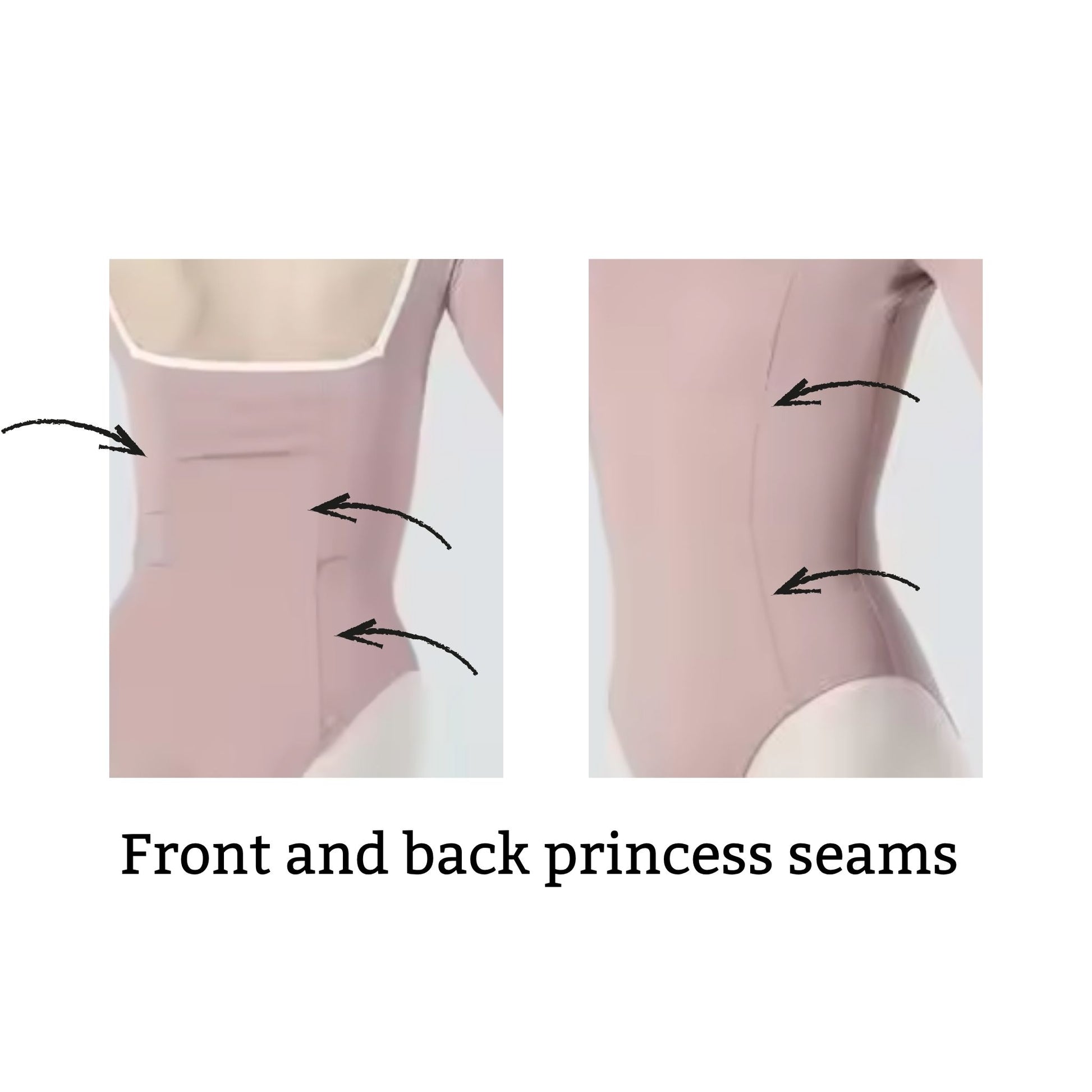 The 3/4 sleeves trace the arm beautifully, creating a graceful line in motion, while the 75% Nylon / 25% Spandex blend offers smooth stretch and a soft, lightweight feel.
